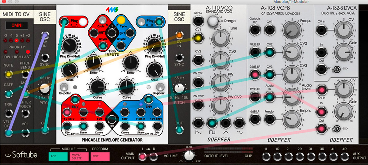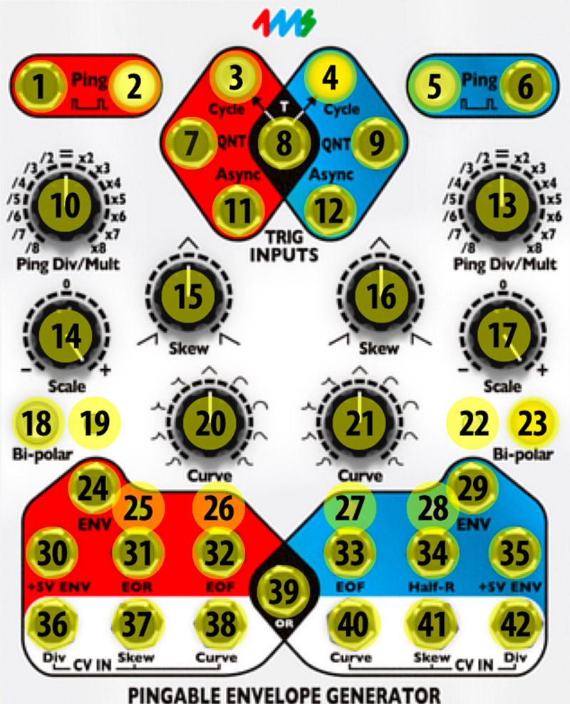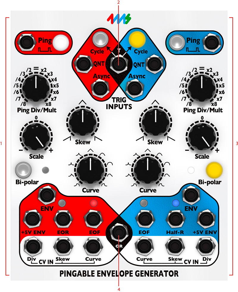 In PEG, CV control over envelope shape, skew and ping (clock) division/multiplication per envelope channel (Red/Blue) is possible. PEG features a multitude of different triggering and cycling options (AD, AR, quantization, cycle, cycle toggle) as well as different level stage trigger outputs (EOR, EOF and Half-R).