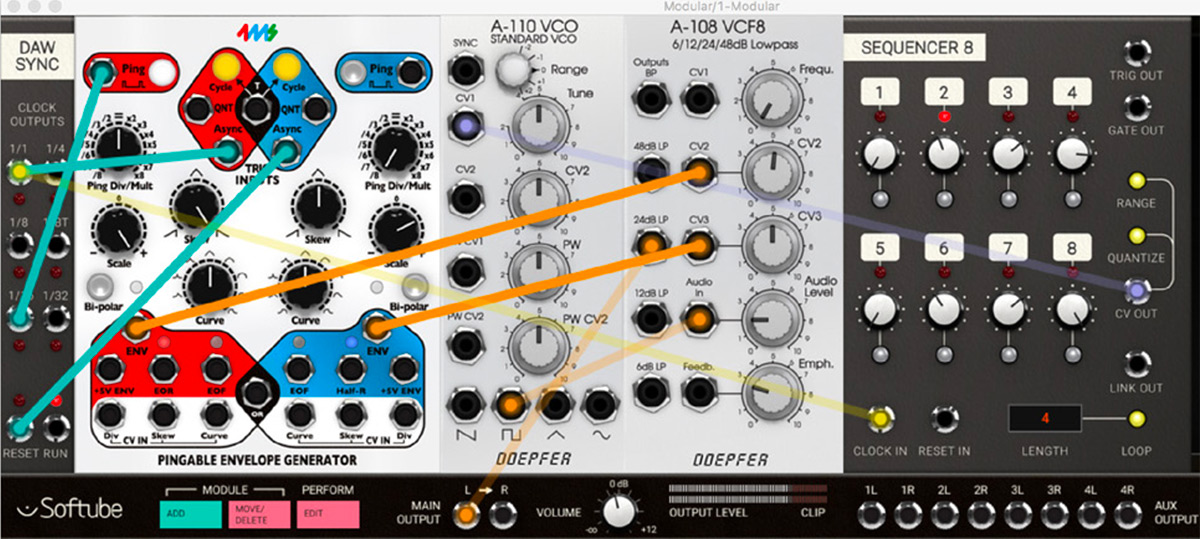 3. DAW synced LFOs - Use the DAW sync module to ping a cycling PEG at a regular pace, for example by using the 16th notes output. The reset jack or whole note jack should also be connected to the Async input to ensure PEG to start at the same phase each time (or each bar when using the whole note output). Using the Tri (preset) shape will be the most common use case when using PEG as an LFO, but of course you can use any shape to create your own customized LFO.