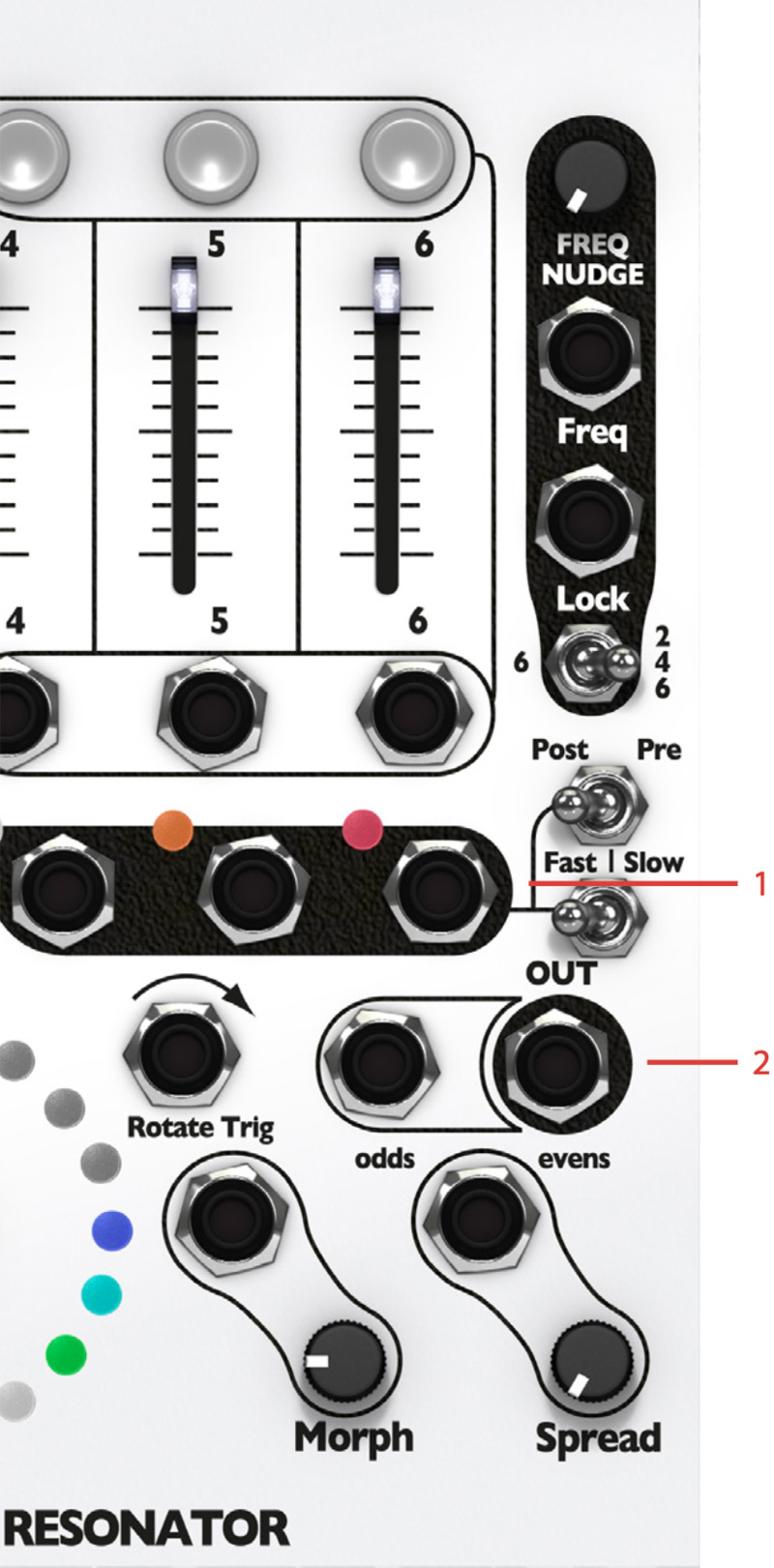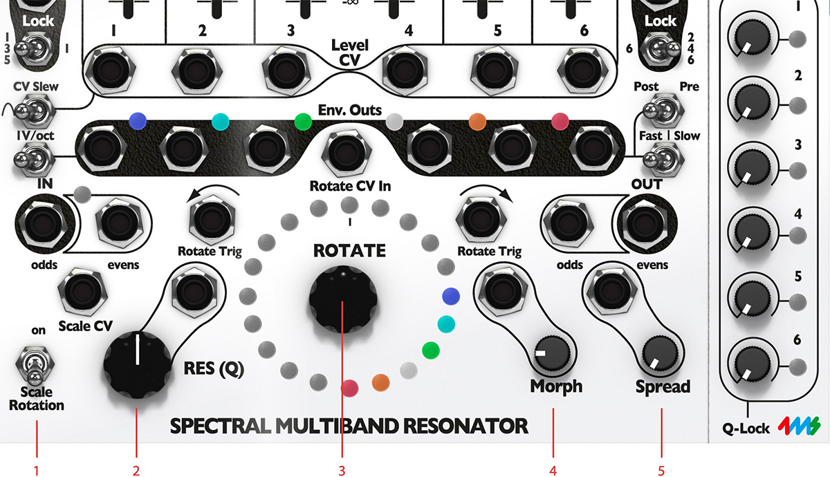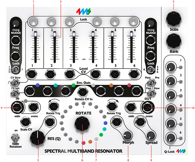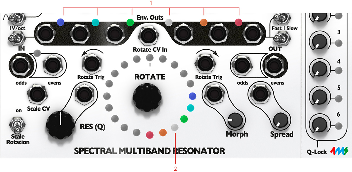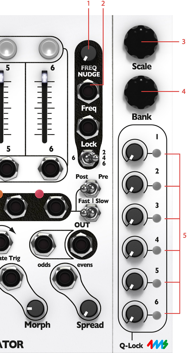 - The Q-locks LEDs indicate that a Q-lock for that particular channel is active, thus that particular channel is not affected by the main Res (Q) knob or Res (Q) CV input jack.