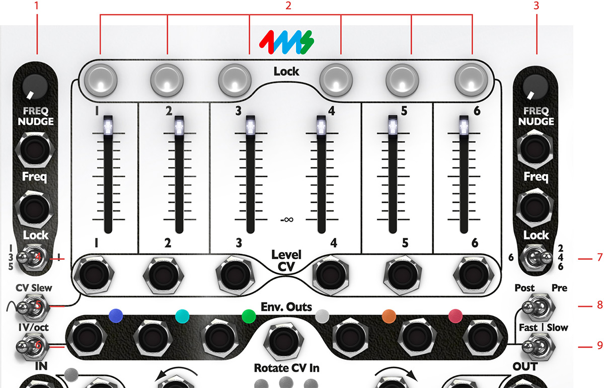 - These inputs are the CV inputs for controlling each band's level. When a CV signal is input here, the Volume Sliders 1-6 will act as attenuators of the incoming CV, meaning that you will still be able to control the maximum volume of each band from the panel.