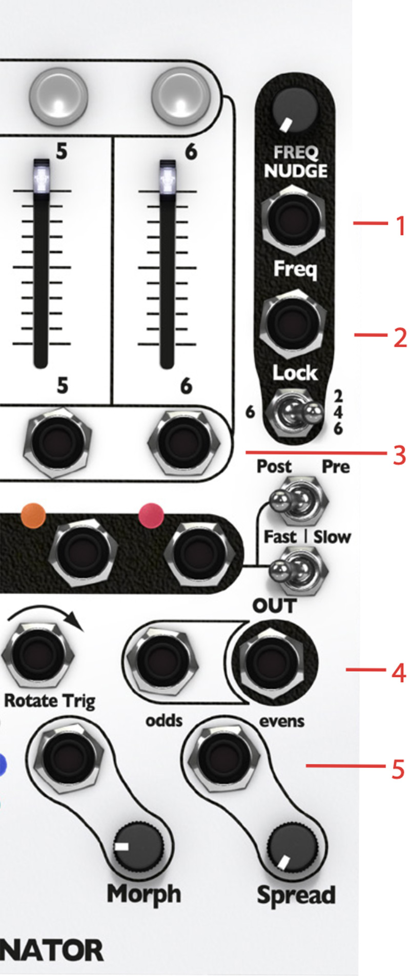 7. Repeat the process (steps 5-7) for channels 2 to 6. Note that for channels 2, 4, and 6 the Freq Nudge knob on the right is used, while for channels 1, 3, and 5, the Freq Nudge knob on the left is used. Make sure the 135 | 1 switch is set to 135, and the 246 | 6 switch is set to 246 (otherwise the respective Freq Nudge knobs will only control channels 1 and 6).