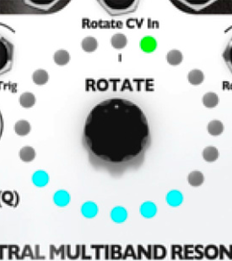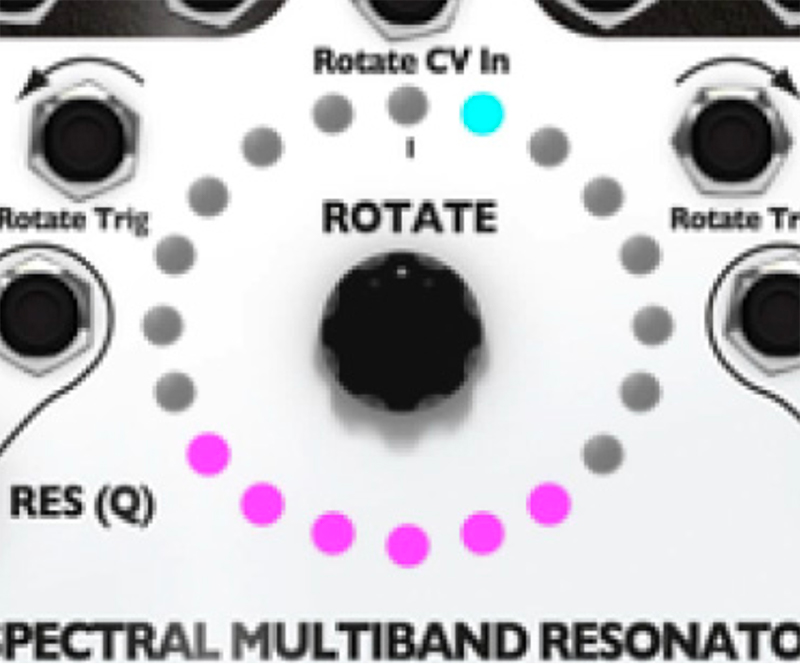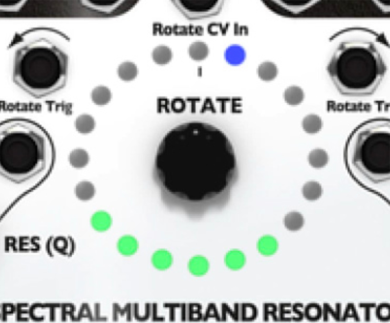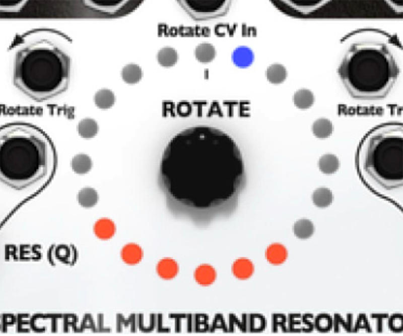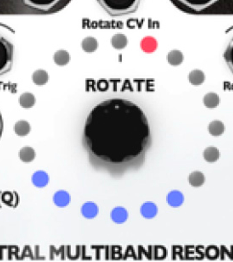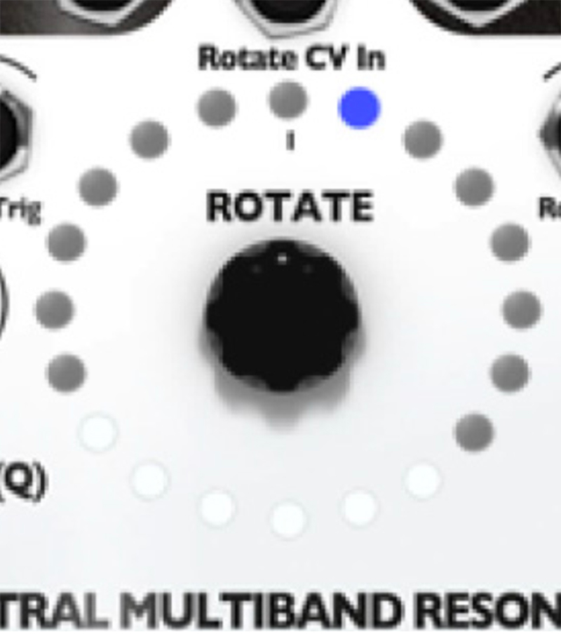 10. Try out playing with the Q (Res) knob. The SMR has a digital noise source normalized to the audio IN jacks. With the Q (Res) knob set to 0%, you should hear a filtered version of this noise. Adjust the sliders, use the Rotate encoder knob and Spread knob to bring in different bands of noise. Notice that, as you increase the Q value by turning the Q (Res) knob, the output slowly changes from filtered noise towards pure sine waves. This is the effect of a tight bandwidth (Q) or resonance where only very select frequencies from the noise source are allowed to pass through to the output. If you have a favorite noise module (or any complex sound source), try running it into the input jack(s).