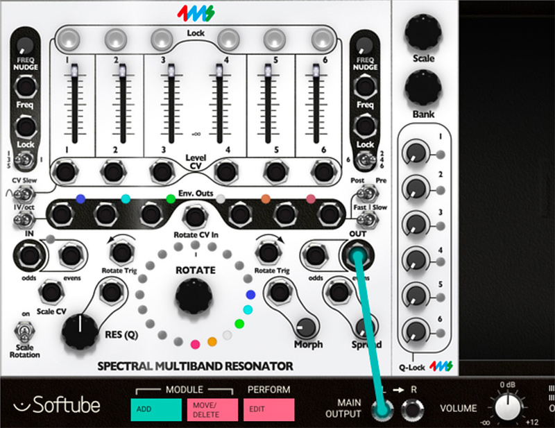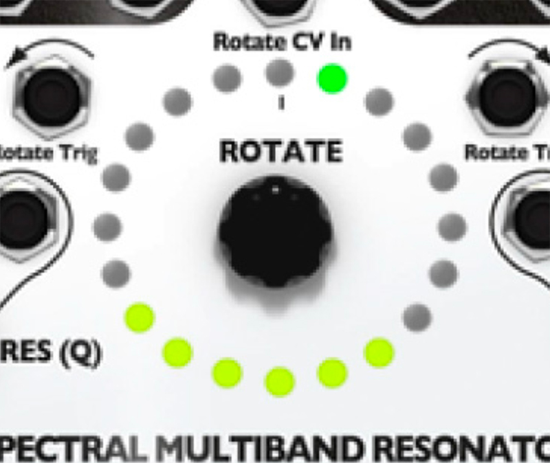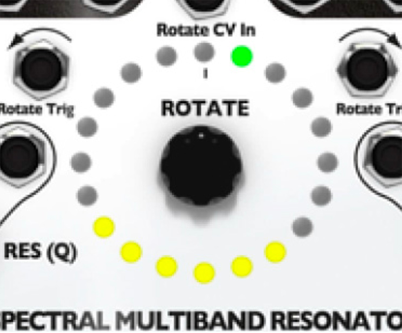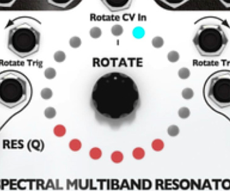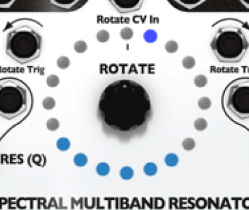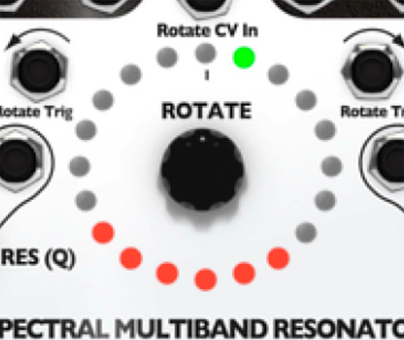 10. Try out playing with the Q (Res) knob. The SMR has a digital noise source normalized to the audio IN jacks. With the Q (Res) knob set to 0%, you should hear a filtered version of this noise. Adjust the sliders, use the Rotate encoder knob and Spread knob to bring in different bands of noise. Notice that, as you increase the Q value by turning the Q (Res) knob, the output slowly changes from filtered noise towards pure sine waves. This is the effect of a tight bandwidth (Q) or resonance where only very select frequencies from the noise source are allowed to pass through to the output. If you have a favorite noise module (or any complex sound source), try running it into the input jack(s).