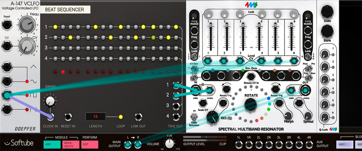 1. Patch the Evens output jack to main output left or, for stereo output, also patch the white Odds output jack to the main output right.