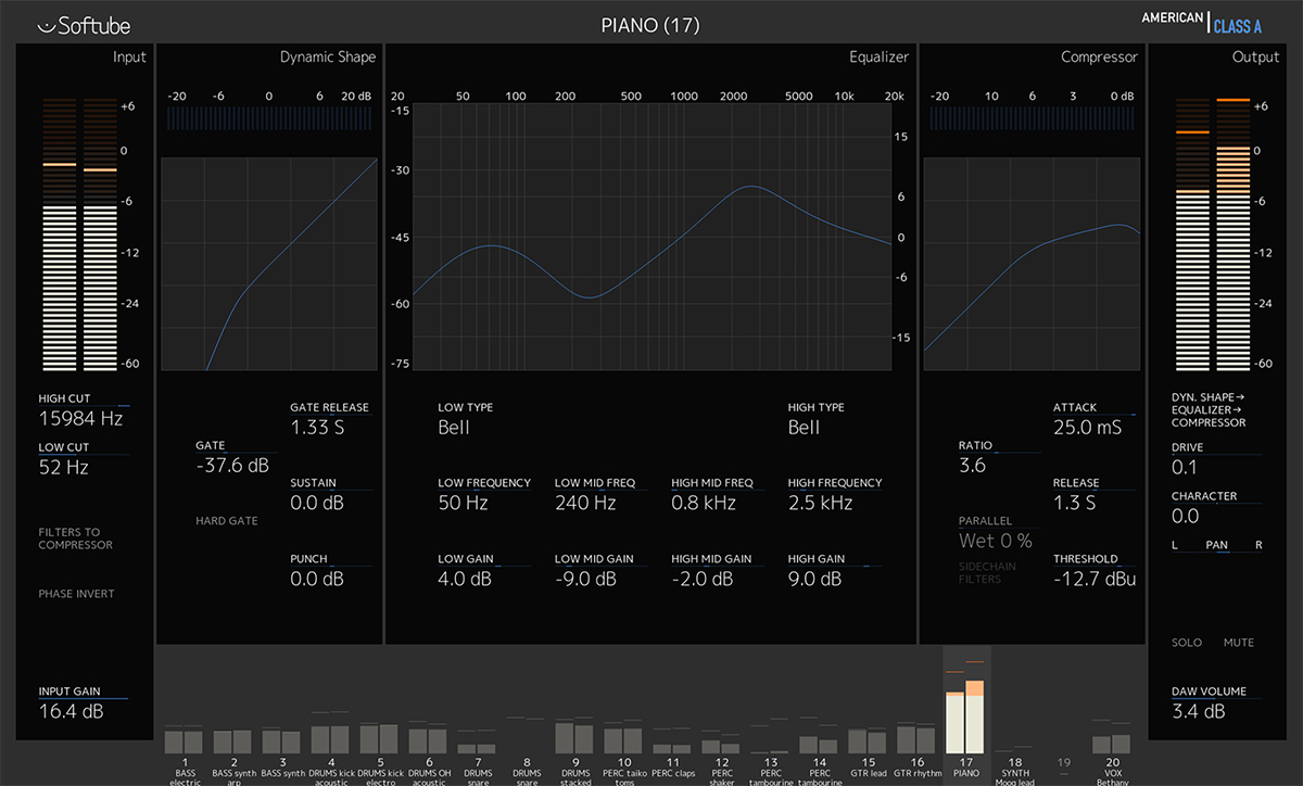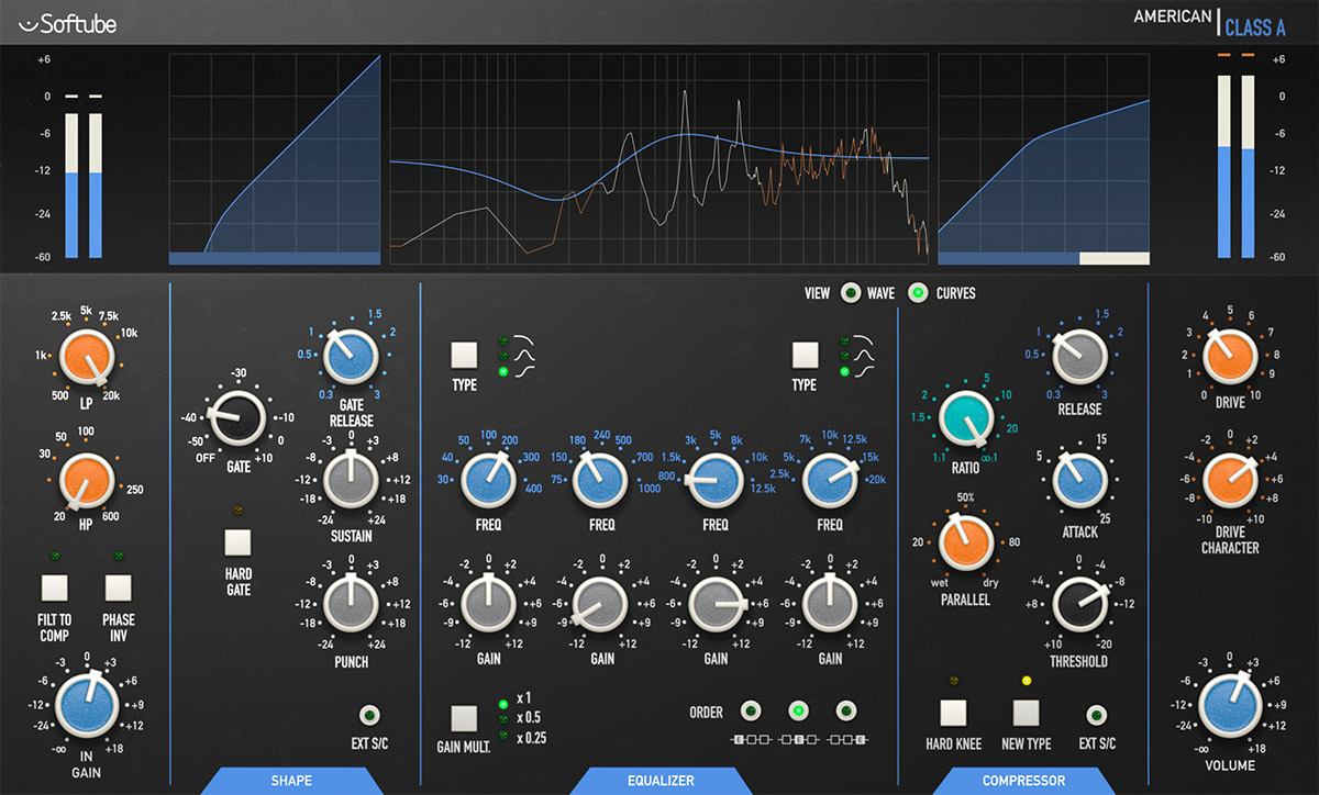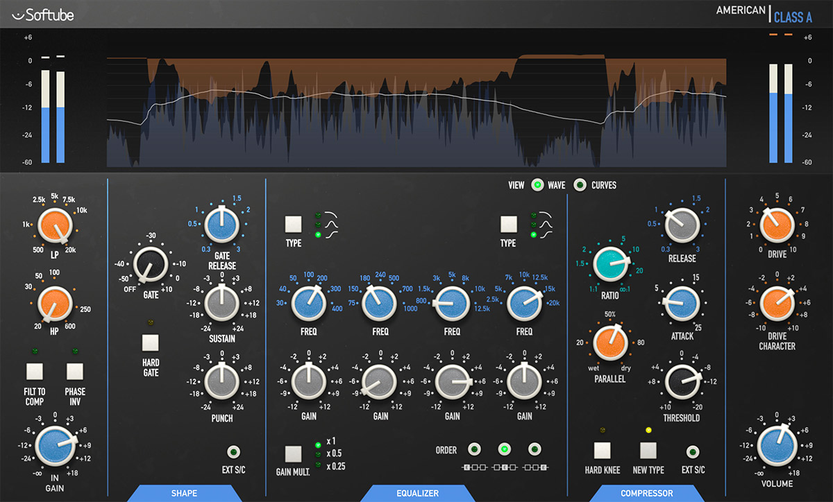 The American Class A follows a format very familiar to Console 1 users, and this plug-in is indeed also a Console 1 channel strip. While we wanted to stay true to the original’s sound and character, we also wanted to expand on some functionality, like the Shape and Drive sections, and get a perfect combination of versatility and character. You may think that a stepped EQ with seven frequencies per band is an unnecessary limitation in today’s digital world, but a lot of the character of this console comes from the way you use it, and limited options in the EQ force you to bring out that character!