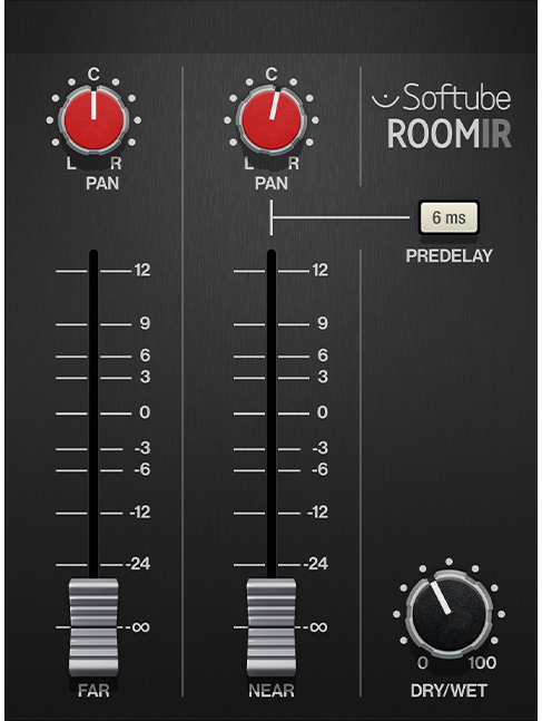 Five room impulse responses are available. All of them have Near and Far faders, plus you can choose to delay the Near response with a pre-set predelay time to achieve a great slap-back effect. The two Pan knobs lets you spread out the room impulses in the stereo field.