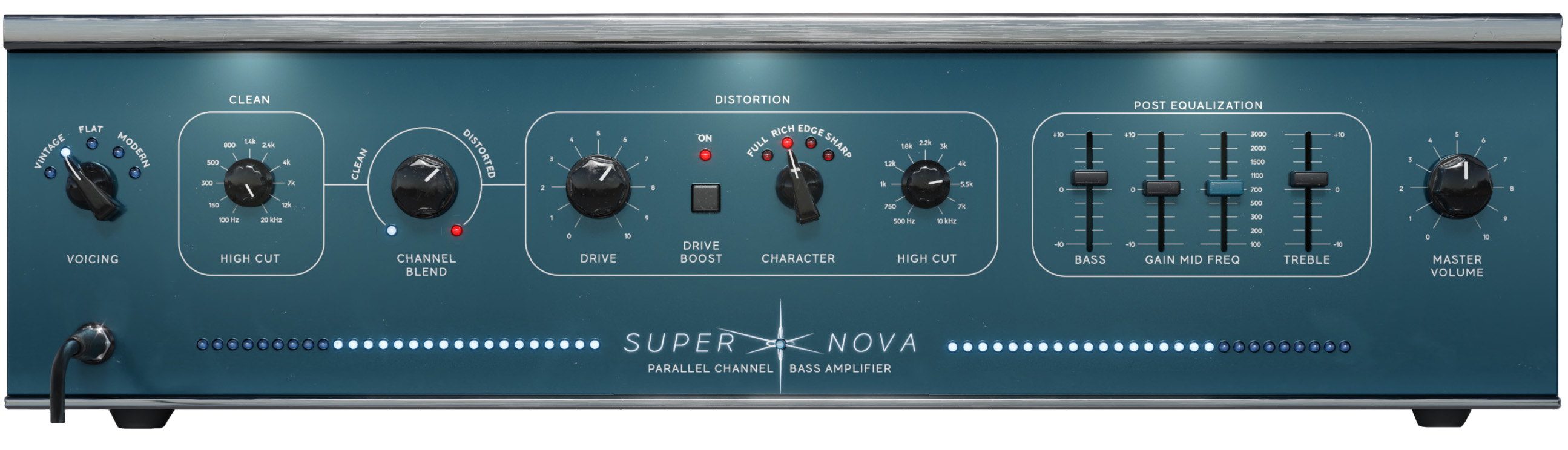 Design your dream bass tone with Supernova, our modern parallel bass amp. You can easily sculpt your tone with the predefined EQ modes and distort one channel to your heart’s content and blend back the clean DI signal and to bring back clarity and rumble in the low end.