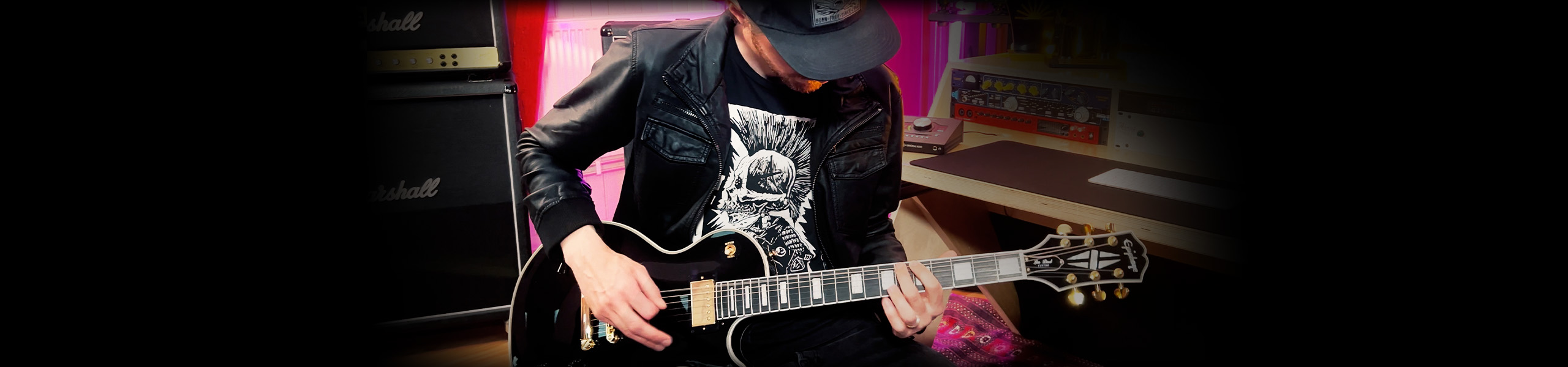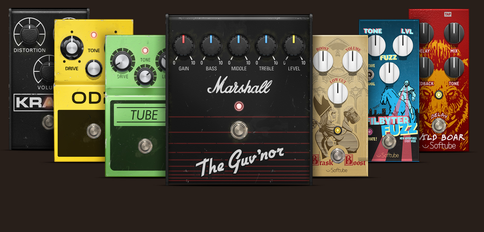 An Amp Room suite packed with officially licensed Marshall amps matched cabs, and pedals, such as Plexi, Silver Jubilee, JMP 2203, Bluesbreaker & Guv’nor
