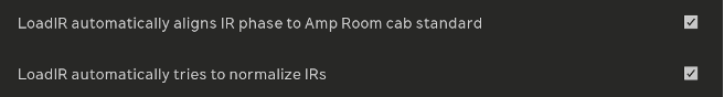 In the Settings menu (cog wheel icon, top right corner) there are two options that concern LoadIR. Normalizing non-factory IRs is to safeguard against third party IRs that might be harmfully loud. Automatically phase aligning third party IRs with Amp Room cabinets and IRs is for safeguarding against getting unwanted artifacts, such as phasing. Both can be unchecked but should be done so with care and at own risk.