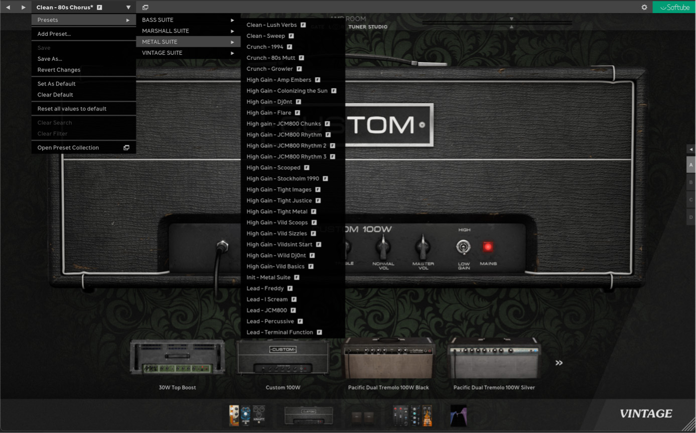 If you own more than one Amp Room Suite, you can switch between Suites by clicking on the Suite selector and selecting another Suite in the list. Choosing a preset from another Suite will automatically switch Amp Room to the Suite where the preset belongs.