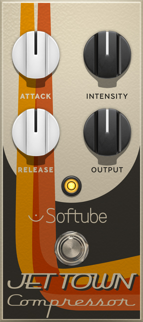 Attack can be set from 2 to 100 ms, and the Release range goes from 50 to 500 ms. Intensity sets the compressor threshold, i.e. the level where compression starts to kick in. In short: Increase the Intensity value to get more compression. Finally, use Output to balance the overall output of the pedal by ± 21 dB.