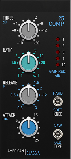Apart from the standard compressor controls, American Class A also features a switch which allows you to choose between a feed forward or a feedback style of compressor. The feed forward (Type = New) is controlled and predictable, while the classic feedback mode (Type = Old) is more punchy.