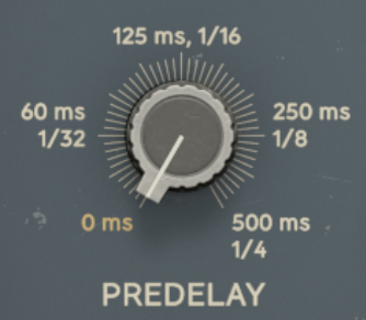 - Sets the time between the end of the initial sound and the onset of the chamber’s early reflections, from 0 to 500 ms. Turn on Predelay Tempo Sync to set the predelay in subdivisions/beats instead, ensuring the predelay syncs to the tempo of the song.