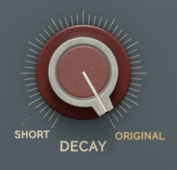 Many of the knobs have a setting marked in yellow, which indicates the “normal” setting that Atlantis Studios uses. With additional options, such as Decay and Mic Distance, the yellow settings (“ORIGINAL” and “FAR”) show the unaltered settings.