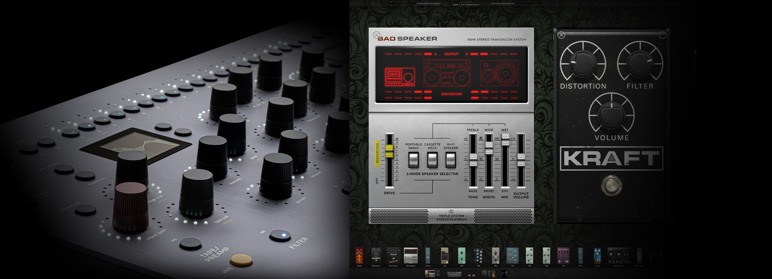 You can add Bad Speaker in the shape and the drive section of Console 1 Mixing System. It's also available for Softube Amp Room, the pro audio guitar and bass platform. Add it as a pre- or post-effect in Amp Room Suite mode or add it anywhere in the signal chain when in Studio mode.