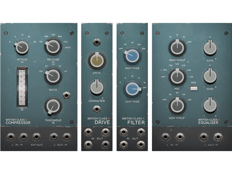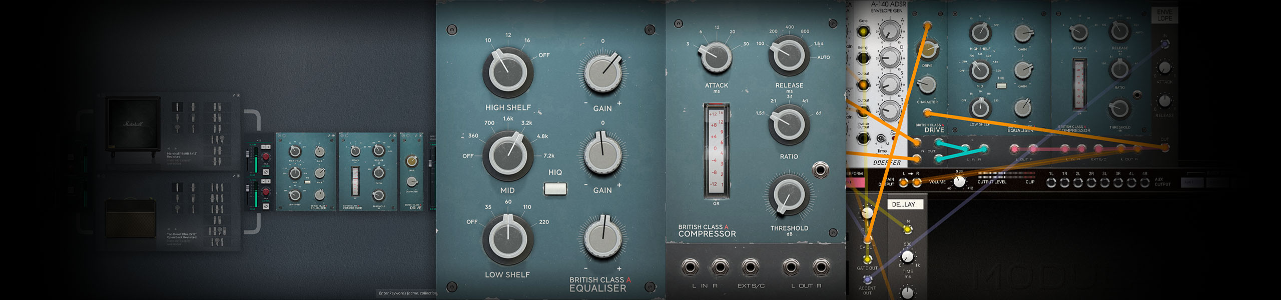 With British Class A for Amp Room and Modular, the perfectly emulated Compressor, Filter, Equalizer, and Drive modules bring the distinguished character of the British Console Sound to your guitar and bass or synth. Mix and match them to conveniently create as much color as you crave—from the inside out.