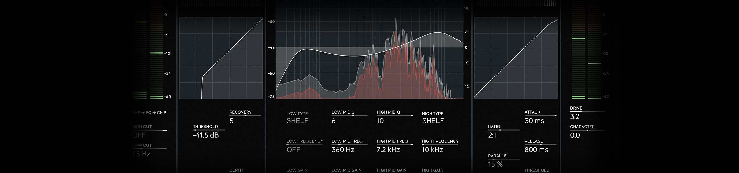Take your sound from dark and stormy to blue skies. Drive simulates running the console channel hot with the saturation, distortion, and tone that occur when doing so. Go from a darker sound with less distortion in the mid-range to bright and clear distortion in the highs.