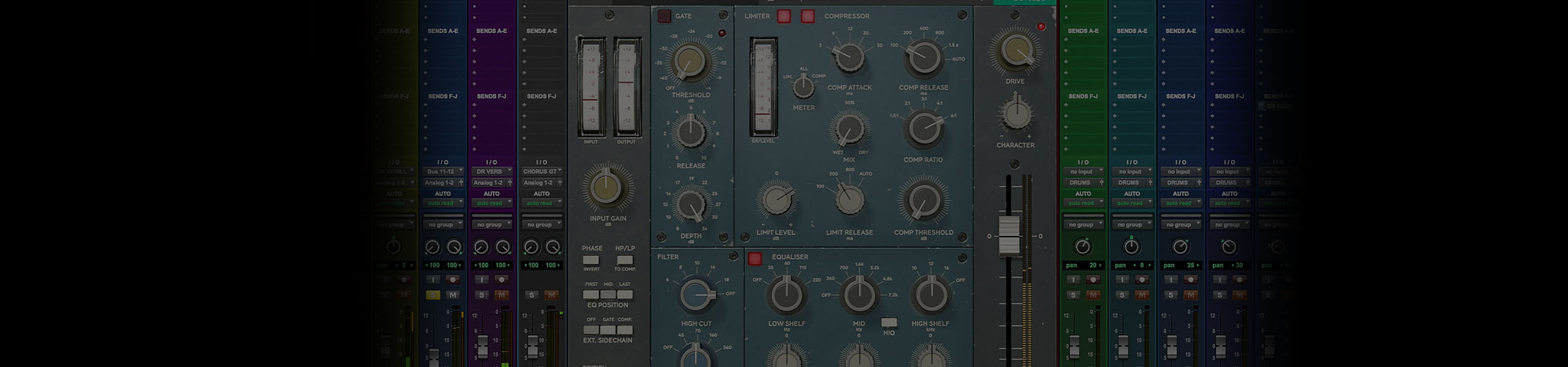 • A channel strip with carefully modeled Gate, Compressor, Filters, EQ, and Drive