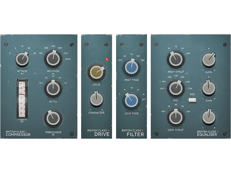 British Class A for Amp Room offers four sections of the channel strip to help you capture the distinct character of the classic British consoles within the pro audio guitar and bass platform. The modules—Compressor, Filter, Equalizer, and Drive—can be mixed and matched to lay it on as thick as you fancy.