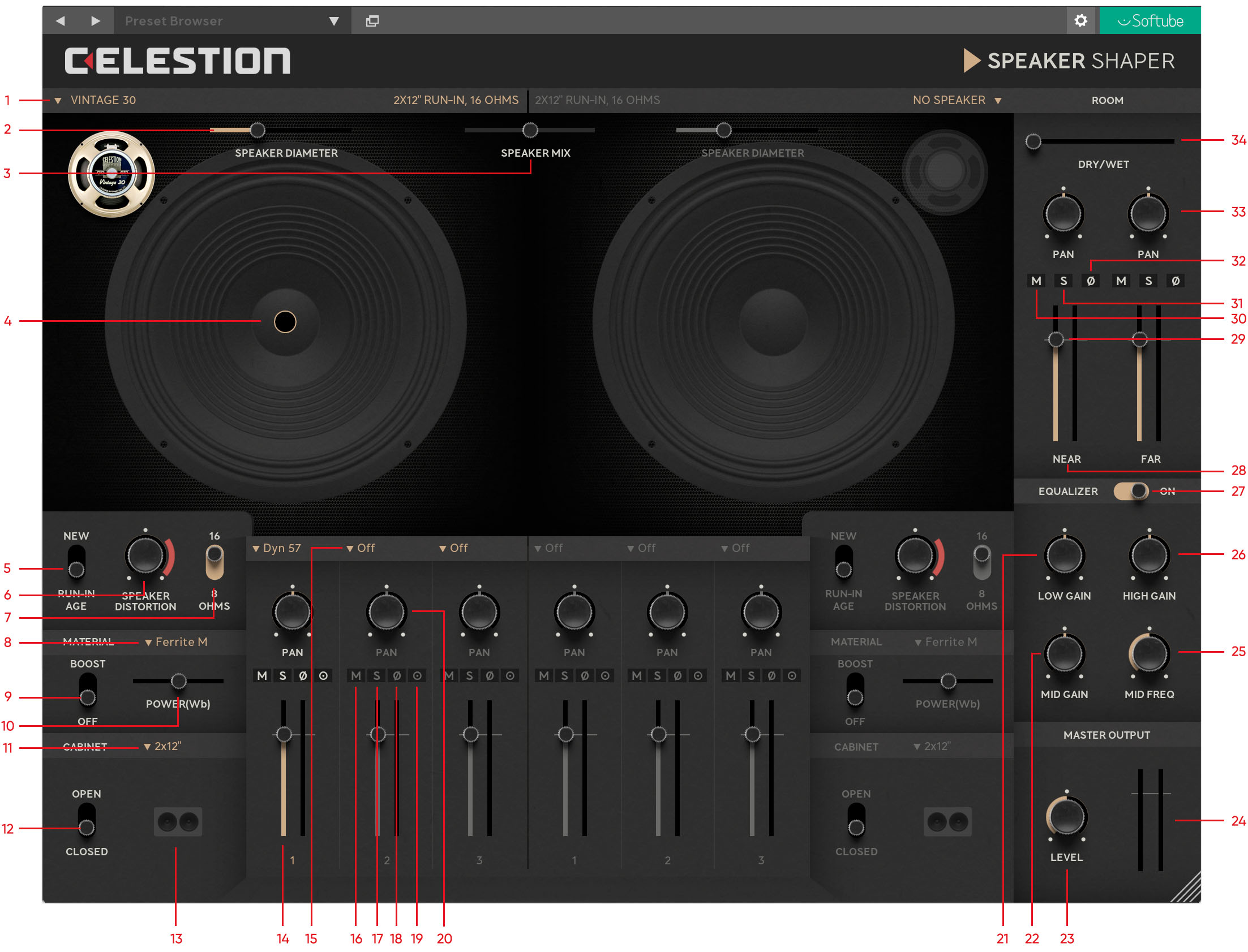 Celestion speakers have been endlessly tried, swapped, discussed and loved by musicians, engineers and enthusiasts over the years. With Celestion Speaker Shaper we want to take the trying and discussing even further than what has previously been possible. Based on the profound treasure trove of measurement data provided by Celestion, Softube has, through extensive testing and iteration, created a “what if”-plug-in where classic Celestion speakers can either be used “as is”, minutely tweaked and refined or taken to the extreme through a vast set of parameters.