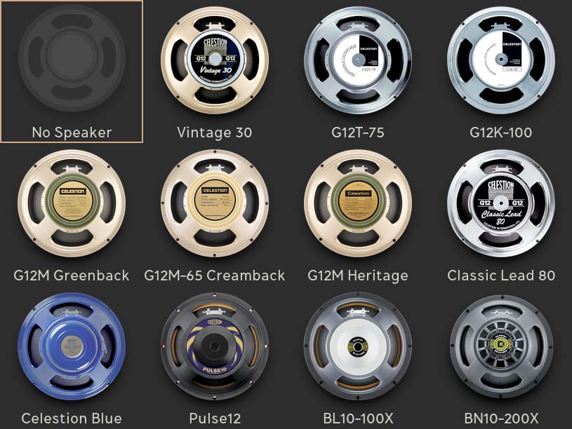 Guitar speakers: Vintage 30, G12T-75, G12K-100, G12M Greenback, G12M-65 Creamback, G12M Heritage, Classic Lead 80 and Celestion Blue.