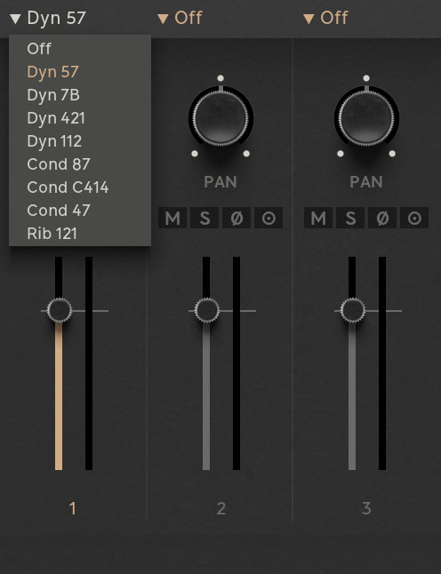 Add a microphone by clicking on the dropdown menu located at the top of each mic fader strip and select a microphone. The chosen microphone will immediately appear at the center of the speaker.