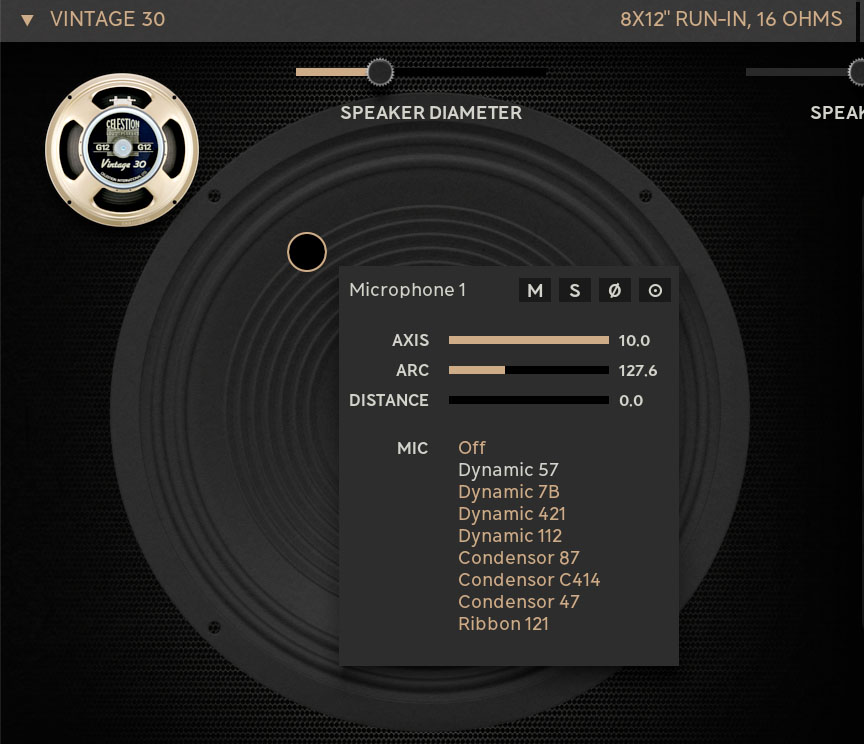 The microphone options are: Dyn 57, Dyn 7B, Dyn 421, Dyn 112, Cond 87, Cond C414, Cond 47 and Rib 121.