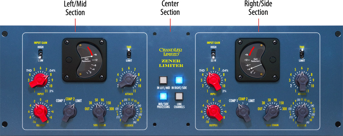 - The Zener has selectable input gain and input impedance via the input gain toggle on the top left of the control panel. This was added so the Limiter could more easily replicate different versions of the RS168 and TG12413 limiters. The high gain setting is 12dB higher and is similar to the “Vanderlism” setting of the RS168 Zener prototype(please refer to the book “Recording the Beatles” for more). The low gain position is closer to the TG12345 console input, however, still hotter than the unity gain input of the TG12413 mastering console version. Input impedance is 300 ohm in High and 1200 ohm in Low.