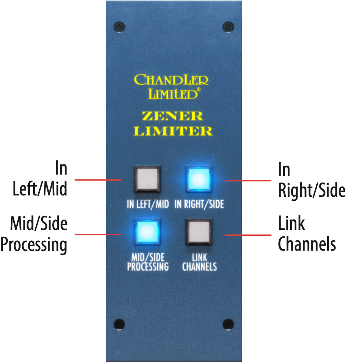 - Activates or bypasses Zener’s processing of the LEFT or MID channel (depending on the position of the Mid/Side Processing button) to facilitate direct comparison of the processed and unprocessed sound.