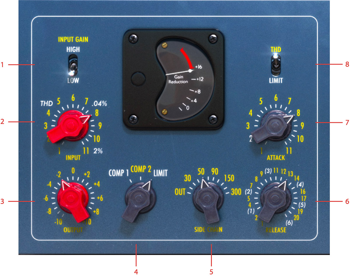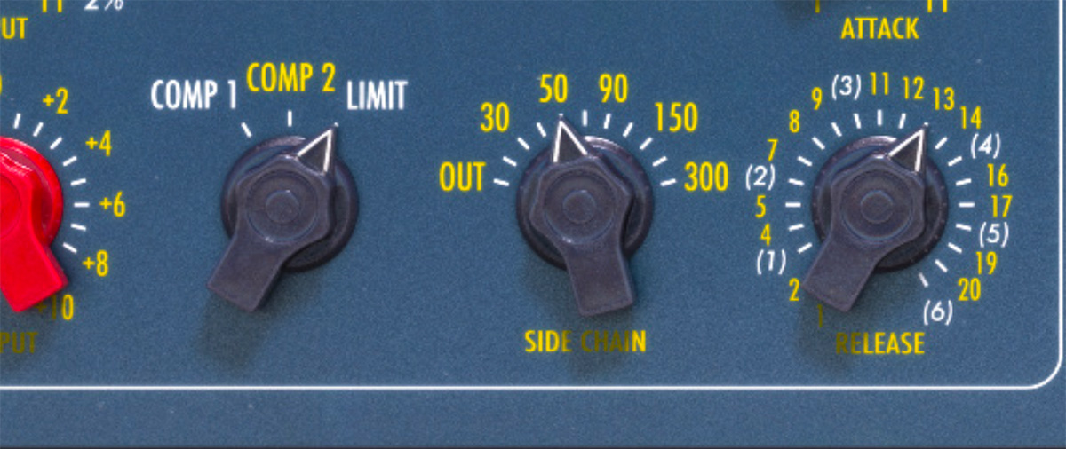 NOTE! The fastest release times, positions 1 and 2, marked in yellow, were mainly chosen for the generally slower acting COMP 1 and 2 modes. When LIMITING very hard on these settings, it may yield unpleasing artifacts and it generally is best to switch to the vintage (1) setting, presented in white; this was the standard fast setting on EMI Limiters.