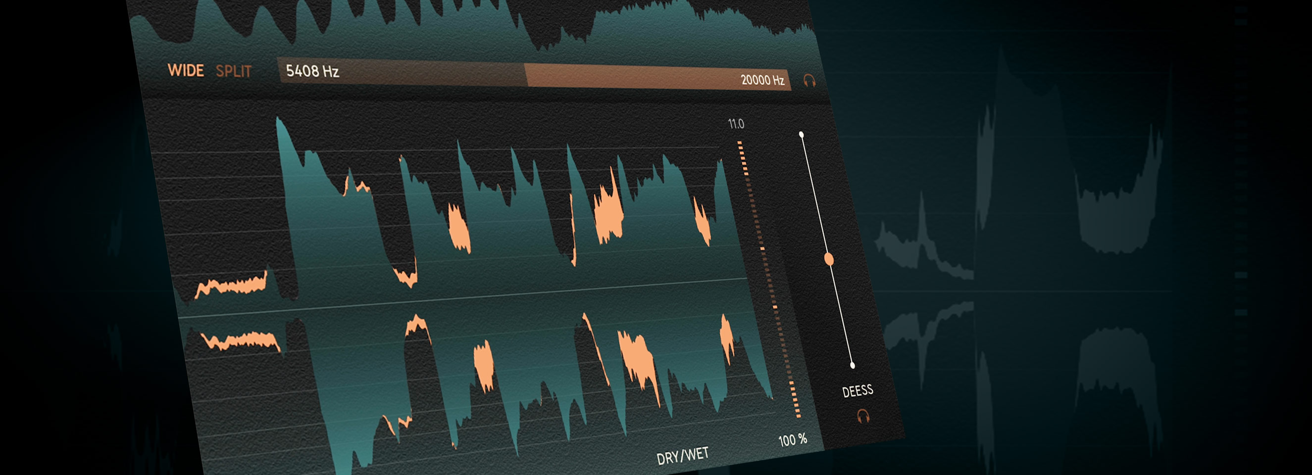 We made sure that the layout of Deesser felt as intuitive as possible so you can handle harsh sibliances with speed and simplicity. All you have to do to start de-essing is just drag the Deess slider. The frequency range of the detector determines where Deesser should listen for problematic frequencies. To set this range, drag the filter widget or type in your desired values. It's as simple as that.