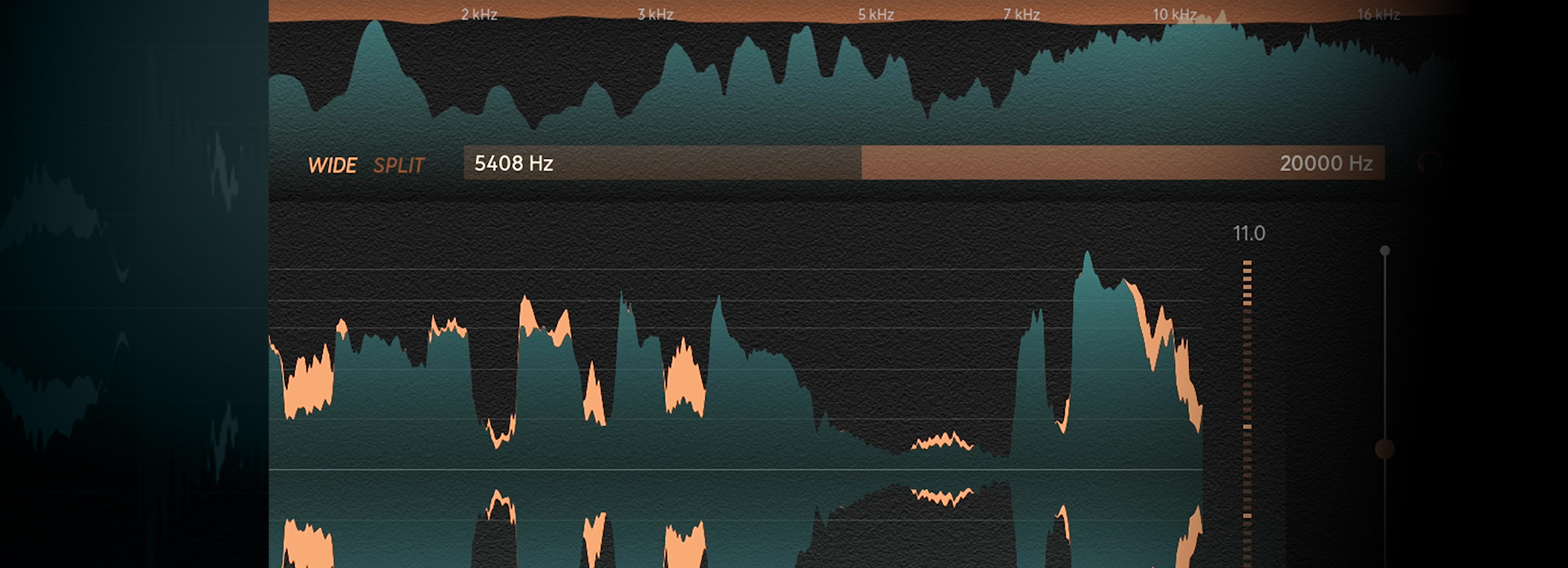 Deesser has everything you need and nothing you don't, which makes for a fast and easy workflow. On the interface, you'll find your key visualizations ready to guide you toward the right choices for your sound. The frequency analyzer on top shows the energy in the frequency spectrum, aiding you in setting the detector range. The frequency analyzer also shows the gain reduction, where the de-essing is applied.