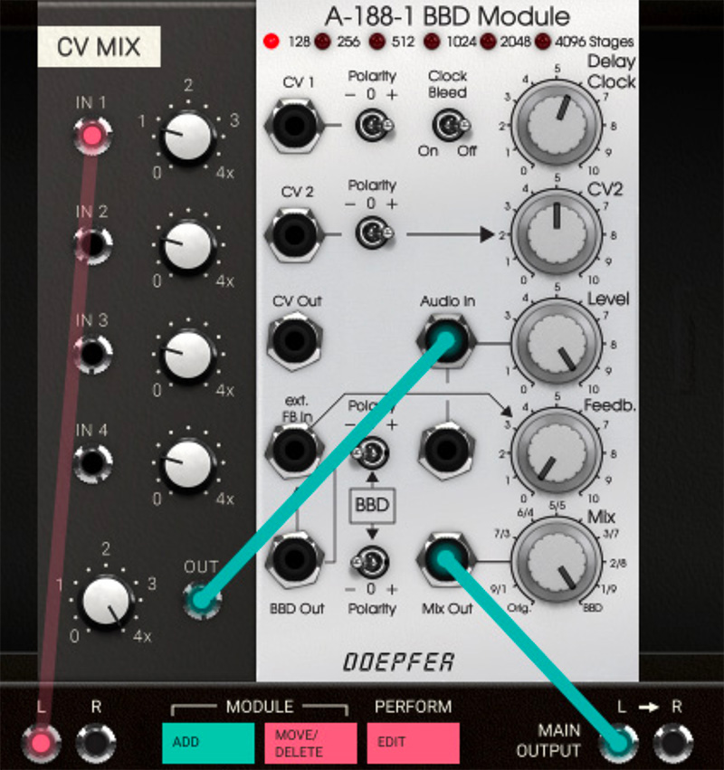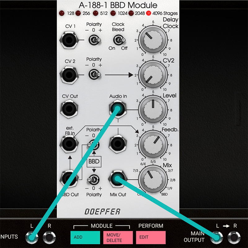 128/256/512/1024/2048/ 4096: these buttons determine how many stages of BBD chip is emulated with the A-188-1 BBD module. Fewer stages tends to work well for short delay-based effects such as flangers and choruses, while more stages work better for longer echoes and reverb-like effects.