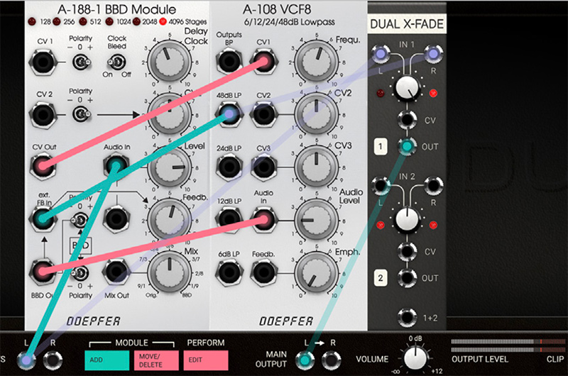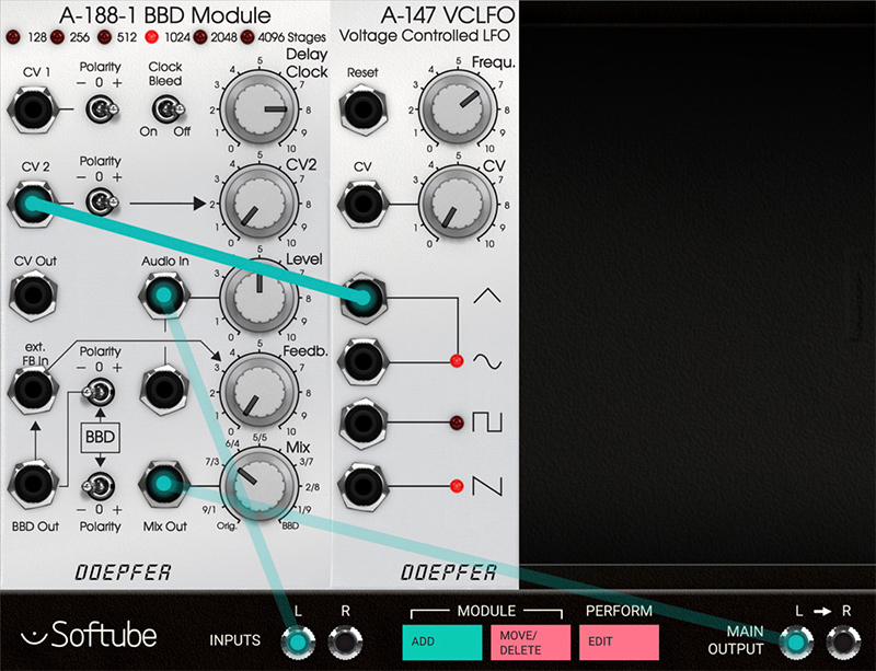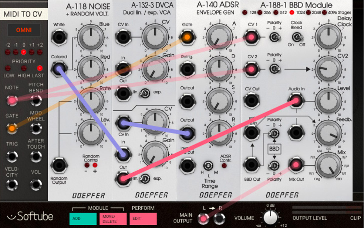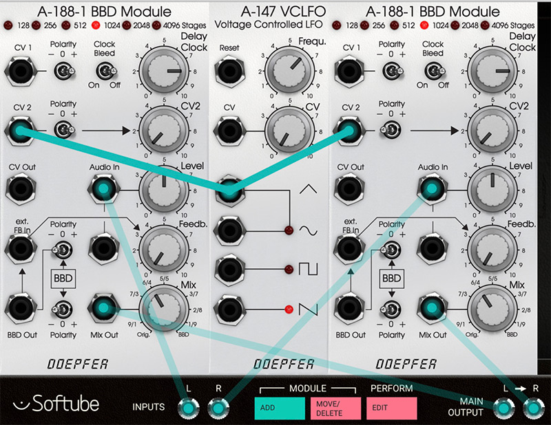 The Doepfer A-188-1 hardware module is normally shipped with one specific BBD chip in order to fit a specific purpose. Some modules ship with a chip with 128 stages, some with 256 stages and so on. The Doepfer A-188-1 hardware we have used came with 1024 stages using a modern BL 3207 BBD chip inside, and was thus the basis of the model used in this Softube emulation. This chip is a bit noisy and the module has apparent clock-bleed through when lowering the clock-frequency, so we have therefore made this noise and clock-bleed optional via the new Clock-bleed switch. Another change from the hardware version is the absence of the clock out and external clock input, simply because it was not possible to emulate and support the extremely high clock-frequencies in the MHz area within Modular.