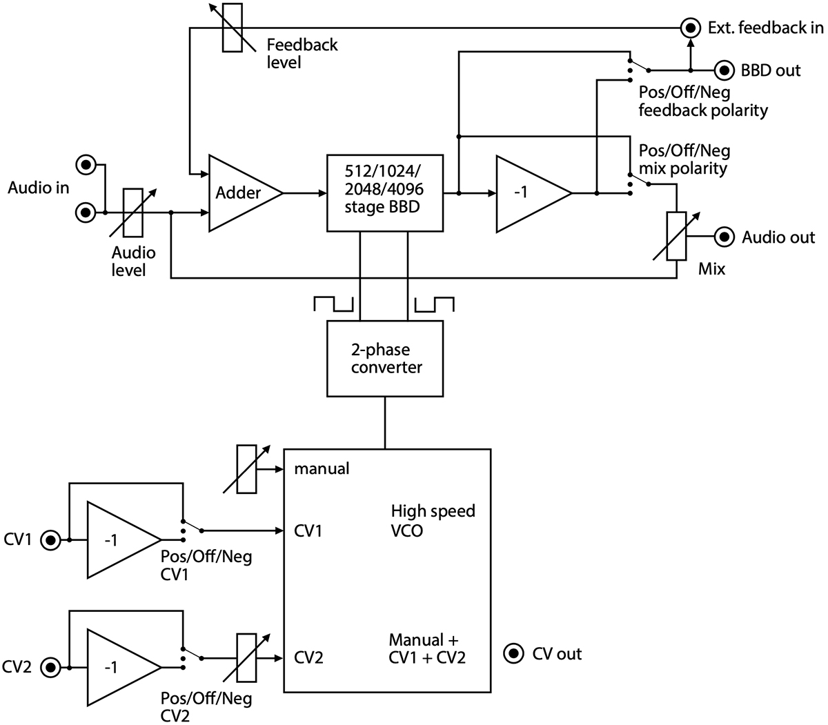 The Mix out Polarity switch will determine whether the wet BBD signal sent to the Mix Out jack is polarity flipped or not. Negative (“-”) value will result in a different sounding feedback than a Positive (“+”) one. When the Mix out Polarity switch is set to “0”, no wet BBD component will be heard in the mix output.