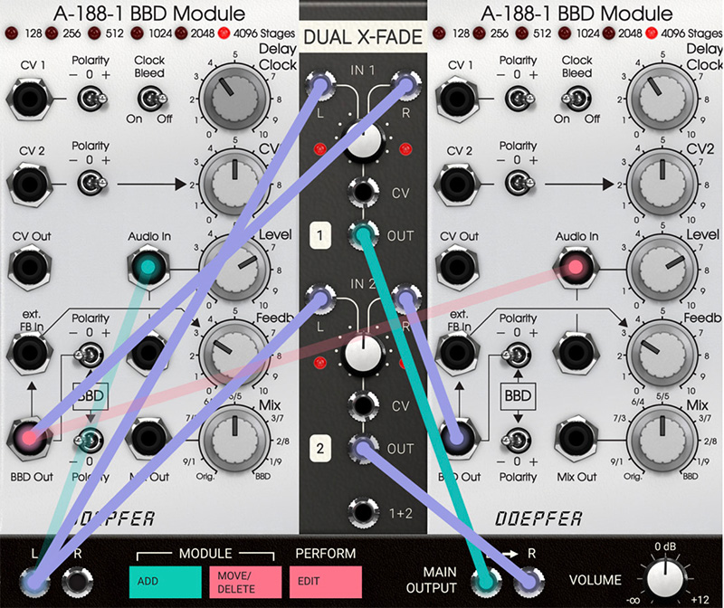 A Stereo chorus is just an extension of the patch described above. Just add another BBD-module and feed that from the same LFO, but with inverse phase. This is done by flipping the CV2 Polarity switch to “-”.