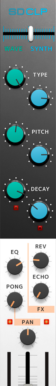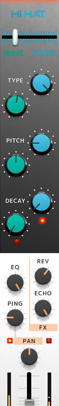 In the Instruments sections, you will see the settings for the instruments. These are all clearly labeled and adjusting them will yield apparent changes to the sound. Below these are the Mixer Channels with effects sends, a one-knob EQ (adapted for each Instrument ) and an auto-pan function called Ping/Pong. The Pan knob and volume fader acts as you would expect, as do the Solo and Mute buttons.