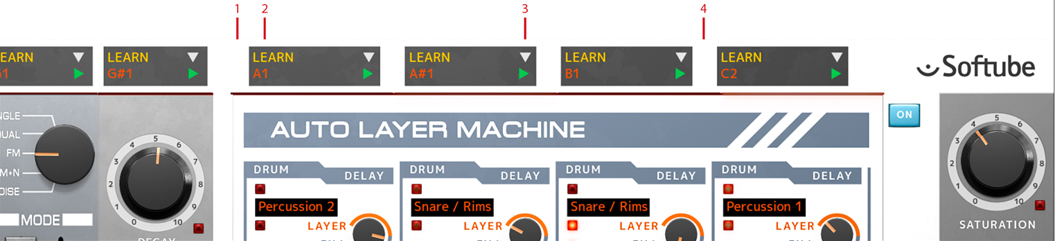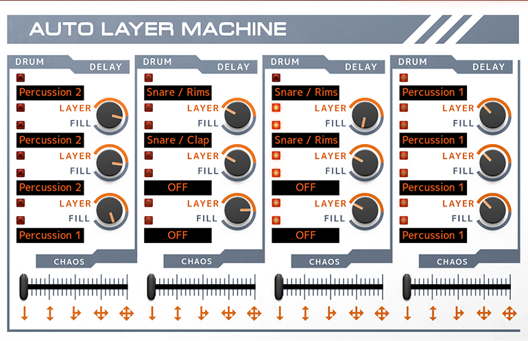 Auto Layer Machine can be used to easily layer sounds from two or more Instruments for new textures, or to trigger flams or autofills. A quick way of learning what it does is to try the different factory presets and note the differences to their settings. Click the white arrow in the Utility section of one of the four Auto Layer Machine channels, and play the pattern by clicking the green arrow, or hitting the MIDI key assigned to that Auto Layer Machine channel (as indicated in red text in the Utility section). Refer to the detailed section for further information.