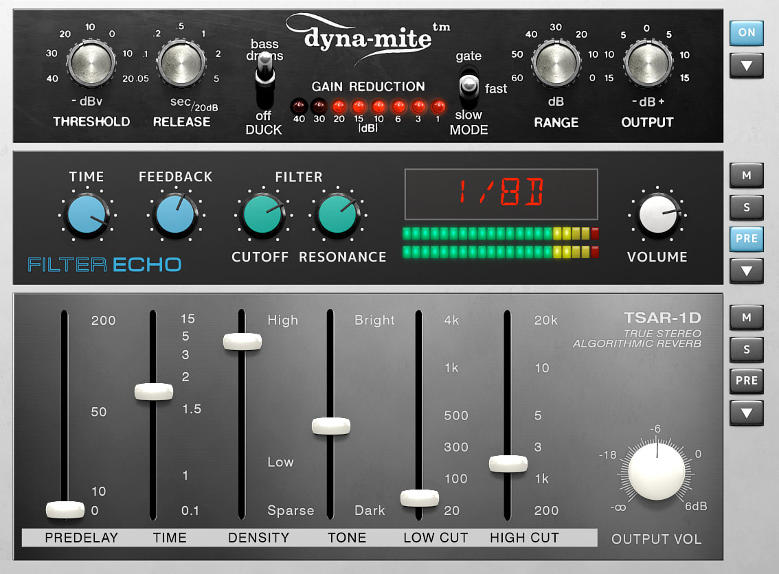 The parameters of the three effects are clearly labeled. The Pre button to the right of Filter Echo and TSAR-1D inserts these effects before the Valley People Dyna-mite, which means the reverb and echo tails are also affected by Dyna-mite’s processing.