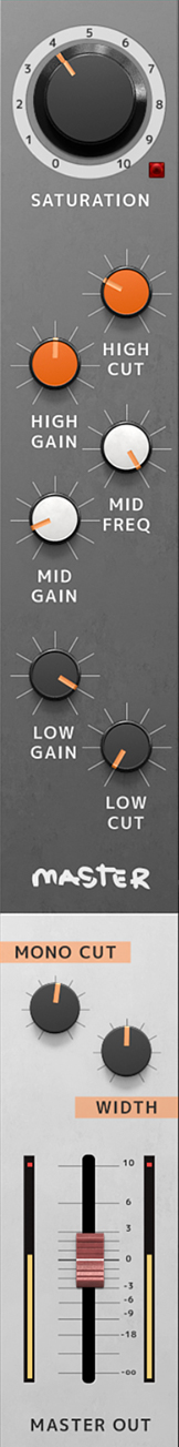 The output from the Instruments and the effects are all summed in the Master Bus. Mono Cut collapses any stereo sounds below the selected cutoff frequency into mono, to ensure phase compatibility in the important lower frequencies. Width makes the entire stereo image wider or narrower.