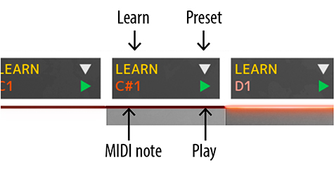 The red MIDI Note indicator is located just below the Learn button, and tells you which MIDI note is assigned to the corresponding Instrument. You can change this by clicking, holding and dragging up/down the MIDI note number, as an alternative to using the Learn function explained above.