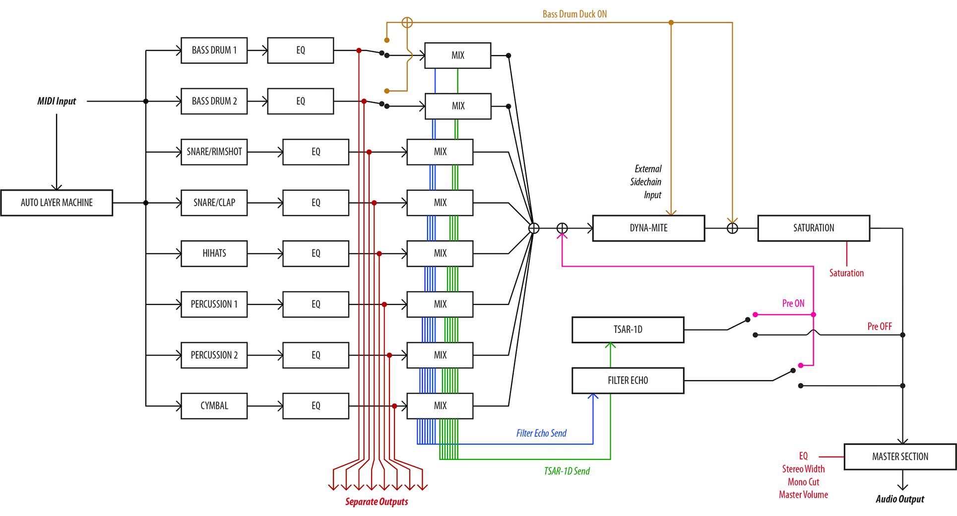 If the TSAR-1 Reverb or Filter Echo’s Pre buttons are activated, the output from the effects are instead routed to the Dyna-mite, instead of directly to the Master Bus section