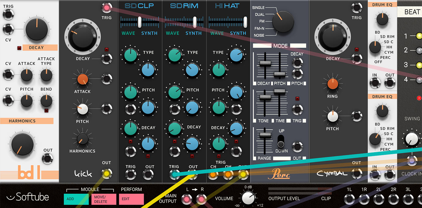 Heartbeat consists of seven drum modules, and a dedicated two-channel one knob equalizer. These are the drum modules from Softube Heartbeat, and if you own and have installed Softube Heartbeat the modules are available right from the Modular.