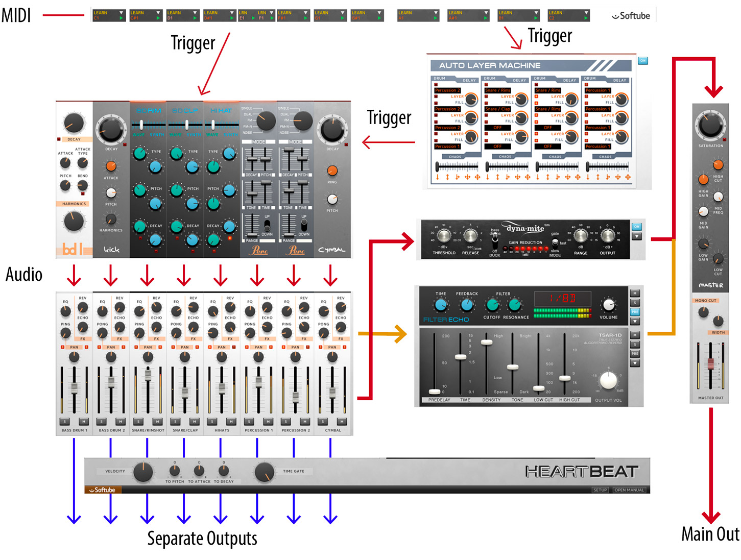 1. The main signal (red) is sent through the mixer channel’s volume fader and mixed with the other instruments, sent to the Valley People Dyna-mite, gets summed with the signal from the send effects, passes through the Master Bus and is eventually sent out via Heartbeat’s Main Out to the DAW channel.