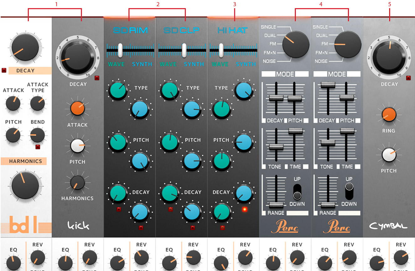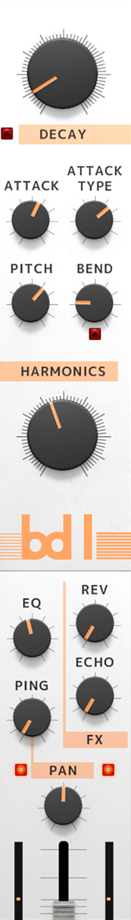 Bass Drum 1 is highly flexible and was inspired by a well known Japanese drum machine from 1984 that went more or less unnoticed until the end of the 80s, when it became the core of the new house music scene of Chicago, Detroit and New York. Its sound stems from a modeled analog synthesized tone with a slight drop in pitch in its decay, augmented with a waveform attack transient.