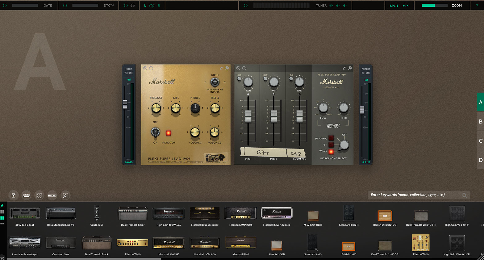 In all these plugins, the amplifier section can be bypassed. This would be the recommended setting, when combining the Marshall Plexi Super Lead 1959 with the cabinets in either of those plugins.