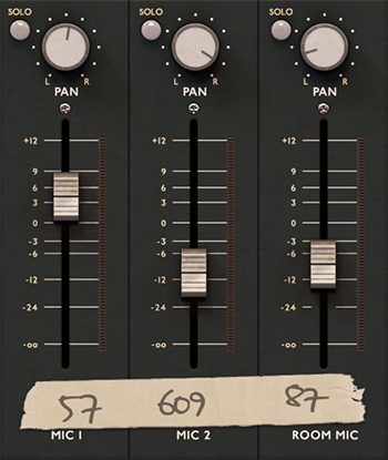 Clicking on the Channel Strip sticker on the right side, gives you access the control panel. Here you can select between the three sets of microphones and adjust their individual levels and panning. The settings are named FET, Valve and Dynamic to indicate what microphone types were used.