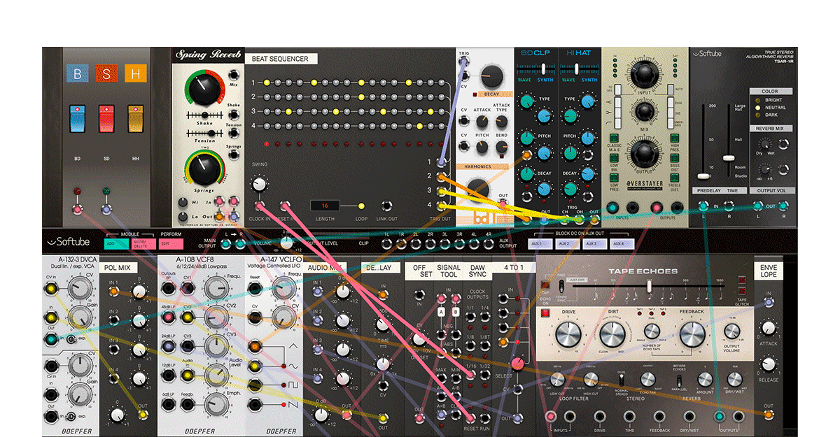 Many Softube effects, including Saturation Knob, Tube Delay, the TSAR-1 and TSAR-1R reverbs, and Spring Reverb can be used as modules in Modular, as can our drum machine, Heartbeat. The possibilities this opens up are as good as endless. CV control your effects with LFOs, random noise, even audio frequency oscillators. Sequence and modulate your Heartbeat modules with all the power of the rest of your patch.