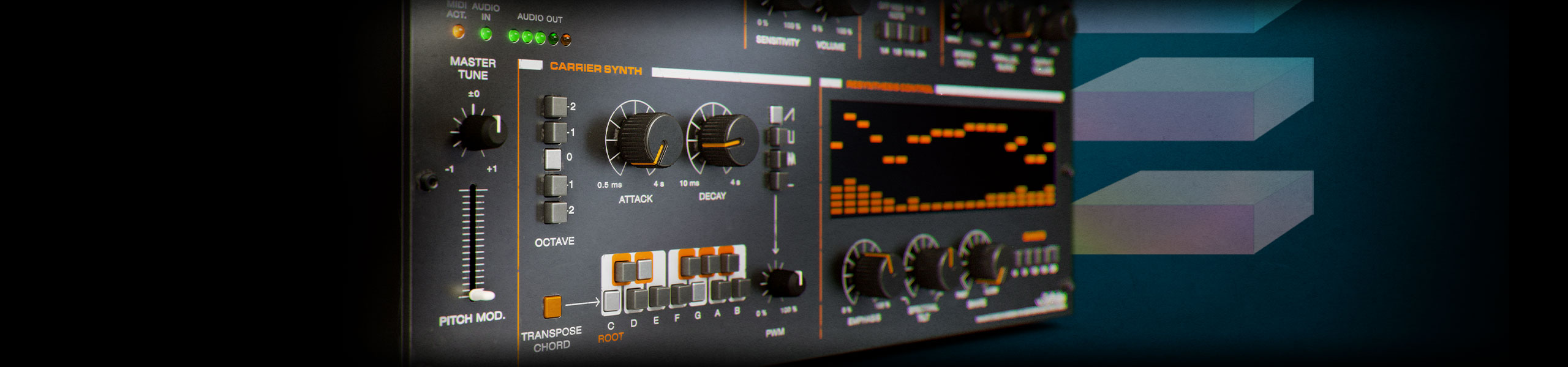 Featuring a six-voice polyphonic carrier synth with four selectable waveforms
