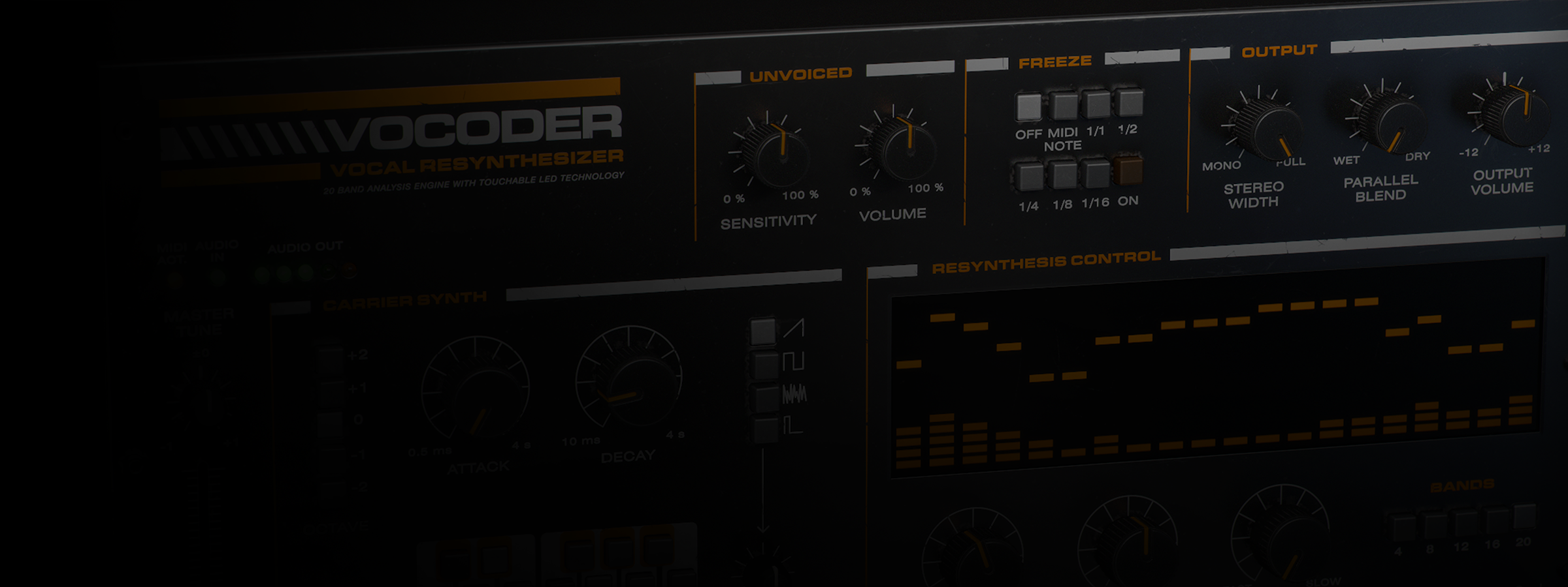 Create everything from full-spectrum synth sounds to android exclamations with variable band selection of four, eight, twelve, sixteen, and twenty. Build stereo width by assigning bands left to right based on odd-even numbering. Three knobs make it simple to adjust the sound of the resynthesis section. Control resonance, tilt to favor higher or lower bands, and adjust the speed versus slop of all the bands at once. And with the fantastical Freeze section, you can free your creative flow. Use the Freeze section to manually make a rhythmic hold of specific formants or employ a DAW sync toset subdivisions of a beat. With unique features and an intuitive workflow, Vocoder inspires artistry of a higher plane.